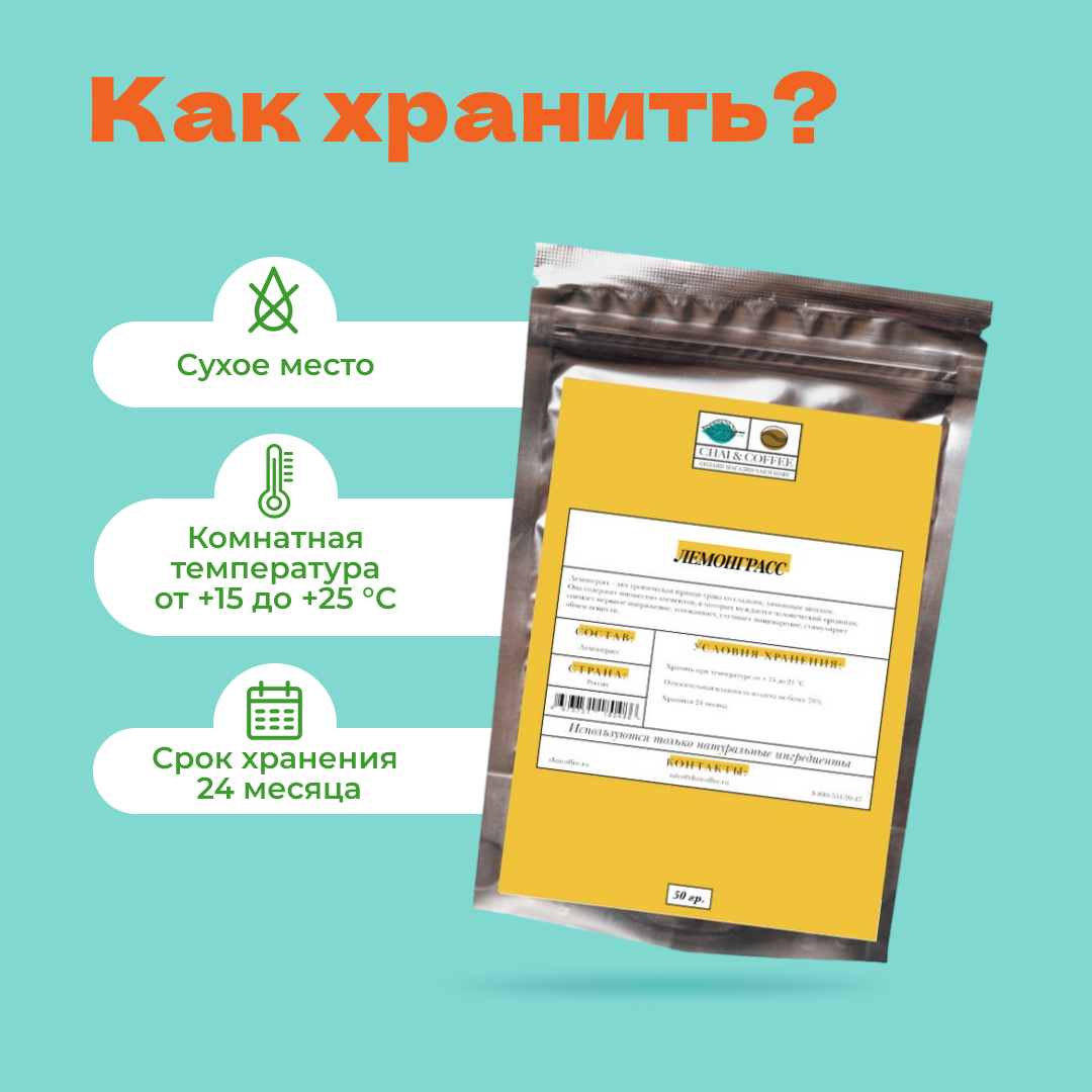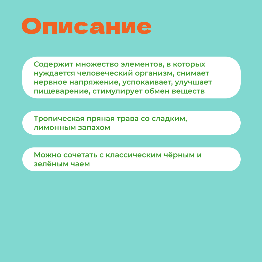 Лемонграсс - тропическая пряная трава со сладким лимонным запахом. Снимает нервное напряжение, успокаивает, улучшает пищеварение, стимулирует обмен веществ.